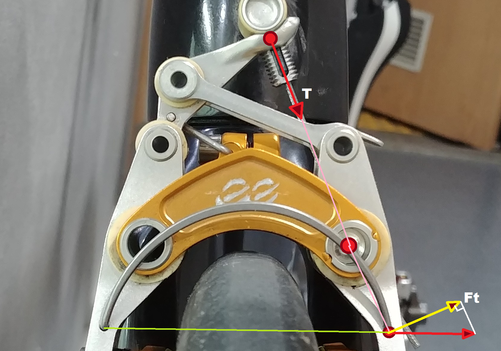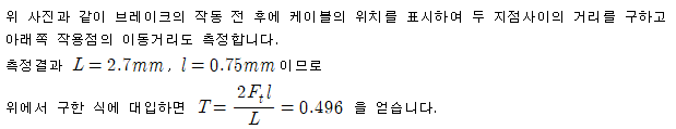 브레이크에는 여러 지렛대와 케이블의 작용들이 있는데 이것들을 모두 고려할 수도 있겠지만,