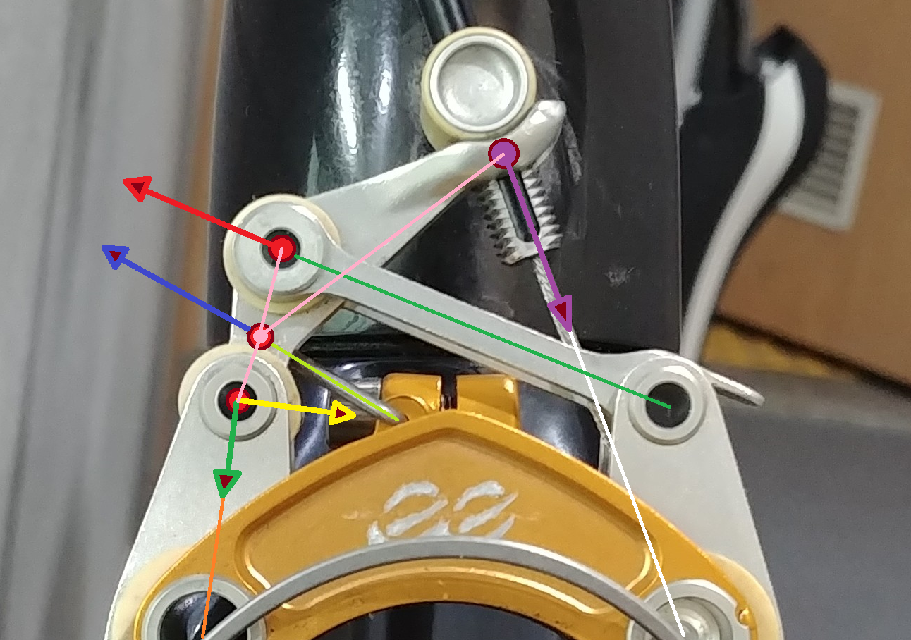 우선 작용점은 그림과 같이 세 곳이고 그 중 가운데 작용점은 노란 패널로 견고하게 연결되어 있습니다.