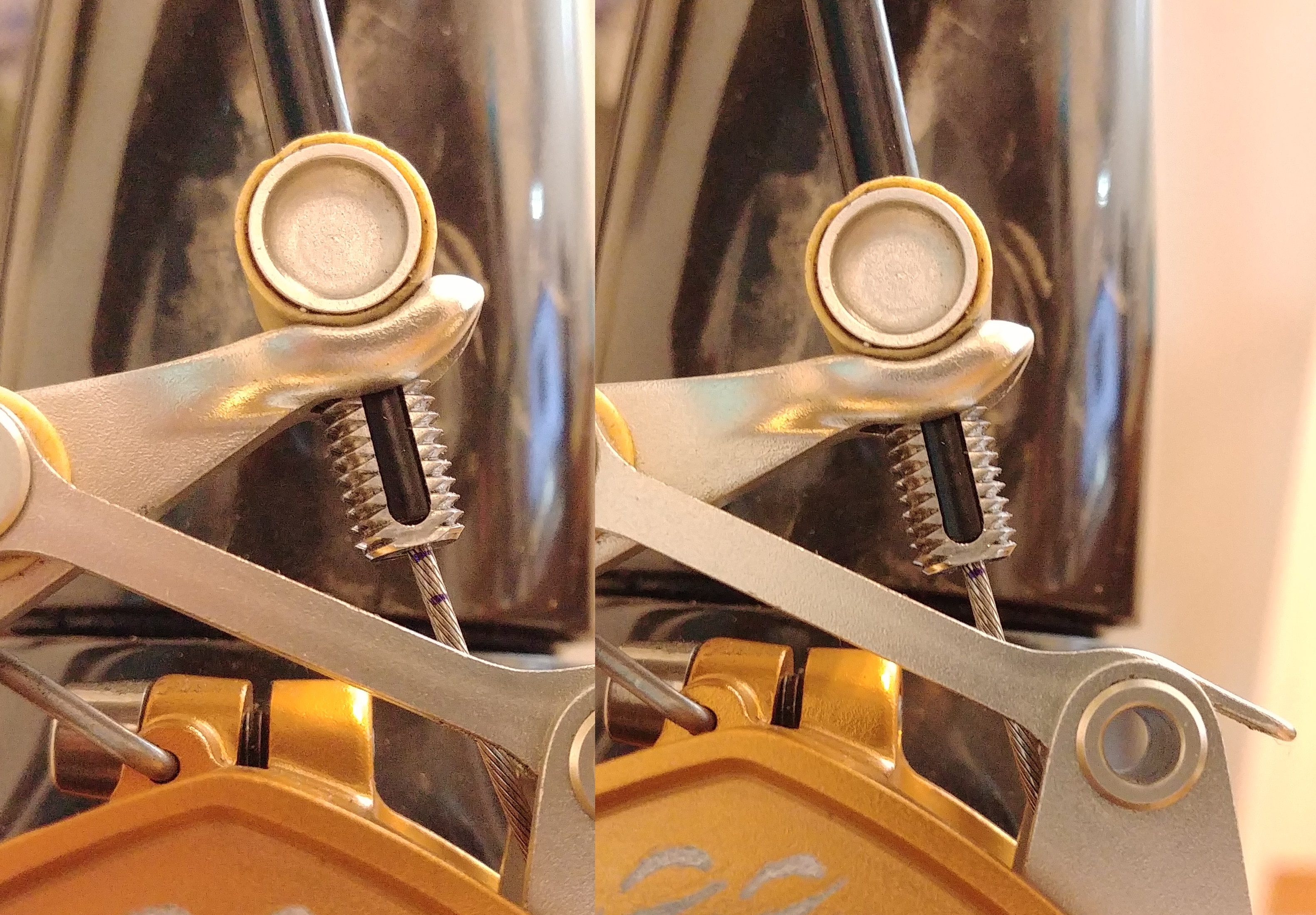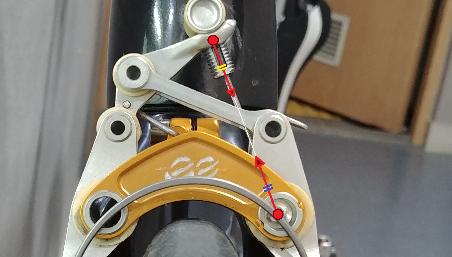 손으로 레버를 잡으면 케이블 하우징과 이너 케이블이 브레이크에 위와같은 두 힘을 가합니다.