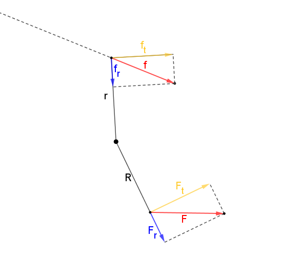 차후의 계산 편의를 위해 가장 아래 있는 작용점이 받는 힘은 원심성분과 접선 성분으로 분해하였습니다.
