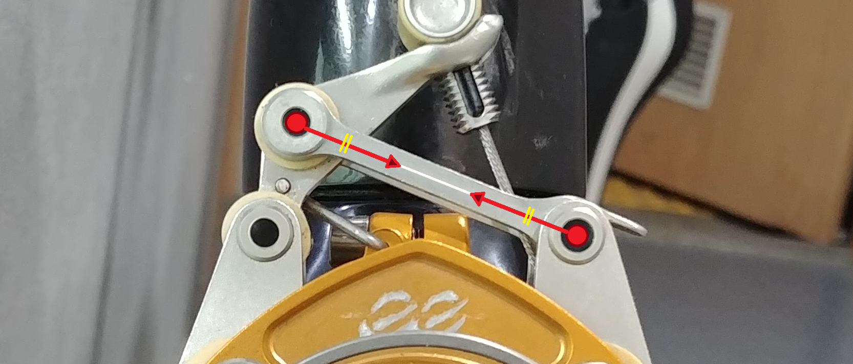 따라서 스프링은 저 두 지점을 통해 브레이크 본체에 서로 벌어지는 방향의 힘을 가해줍니다.